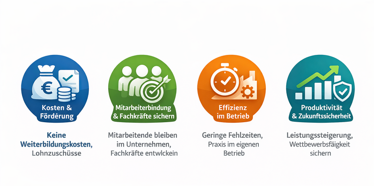 Mitarbeiterqualifizierung ist ein entscheidender Erfolgsfaktor für Unternehmen: Sie sichert Fachkräfte, stärkt die Bindung bestehender Mitarbeitender und sorgt für mehr Effizienz im Betriebsalltag. Durch praxisnahe Weiterbildung entstehen kaum Ausfallzeiten, während gleichzeitig neue Kompetenzen aufgebaut werden. Zusätzlich profitieren Unternehmen von attraktiven Fördermöglichkeiten und Lohnzuschüssen. So steigern Betriebe ihre Produktivität und stellen langfristig ihre Wettbewerbsfähigkeit sicher.