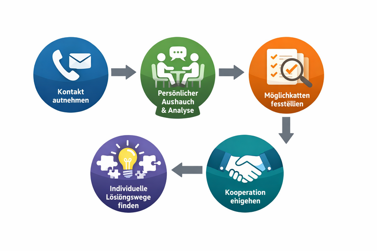 Vom ersten Kontakt bis zur erfolgreichen Kooperation: Die Eckert Schulen begleiten Unternehmen Schritt für Schritt auf dem Weg zur passenden Lösung. In einem persönlichen Austausch wird der individuelle Bedarf analysiert, darauf aufbauend werden geeignete Möglichkeiten der Zusammenarbeit aufgezeigt und passgenaue Lösungswege entwickelt. Transparent, effizient und auf Augenhöhe.