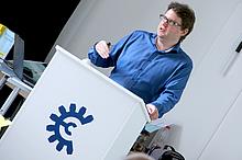 Hacker erklärte die Bedeutung der Schalungstechnik, relevante Auswahlkriterien, Planung einer Schalung und nicht zuletzt den wirtschaftlich optimierten Einsatz von Schalungselementen. Bei Deckentischen etwa kommen Kräne für horizontale und vertikale Umsetzvorgänge zum Einsatz. Eine besondere Belastungsprobe für die Baustellenlogistik – zudem entstehen damit längere Wartezeiten und somit auch Kosten. „Alles andere als zeitgemäß“, so Hacker. Doka bietet hier eine einmalige Branchenlösung: DoKart plus ist ein spezielles Umsetzgerät für Deckentische. „Ein Mann alleine kann Deckentische sicher und ergonomisch Umsetzen.“ Durch die enorme Wendigkeit des Kompaktgeräts vereinfachen sich die Arbeitsabläufe erheblich.