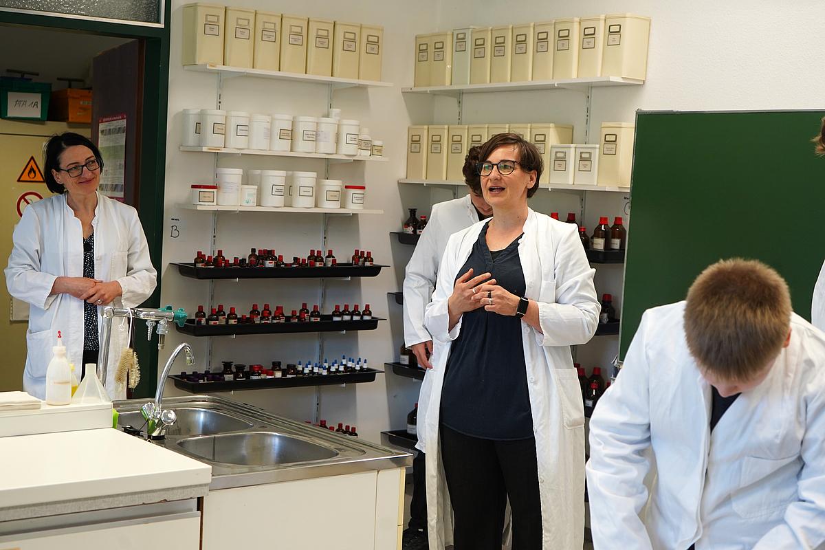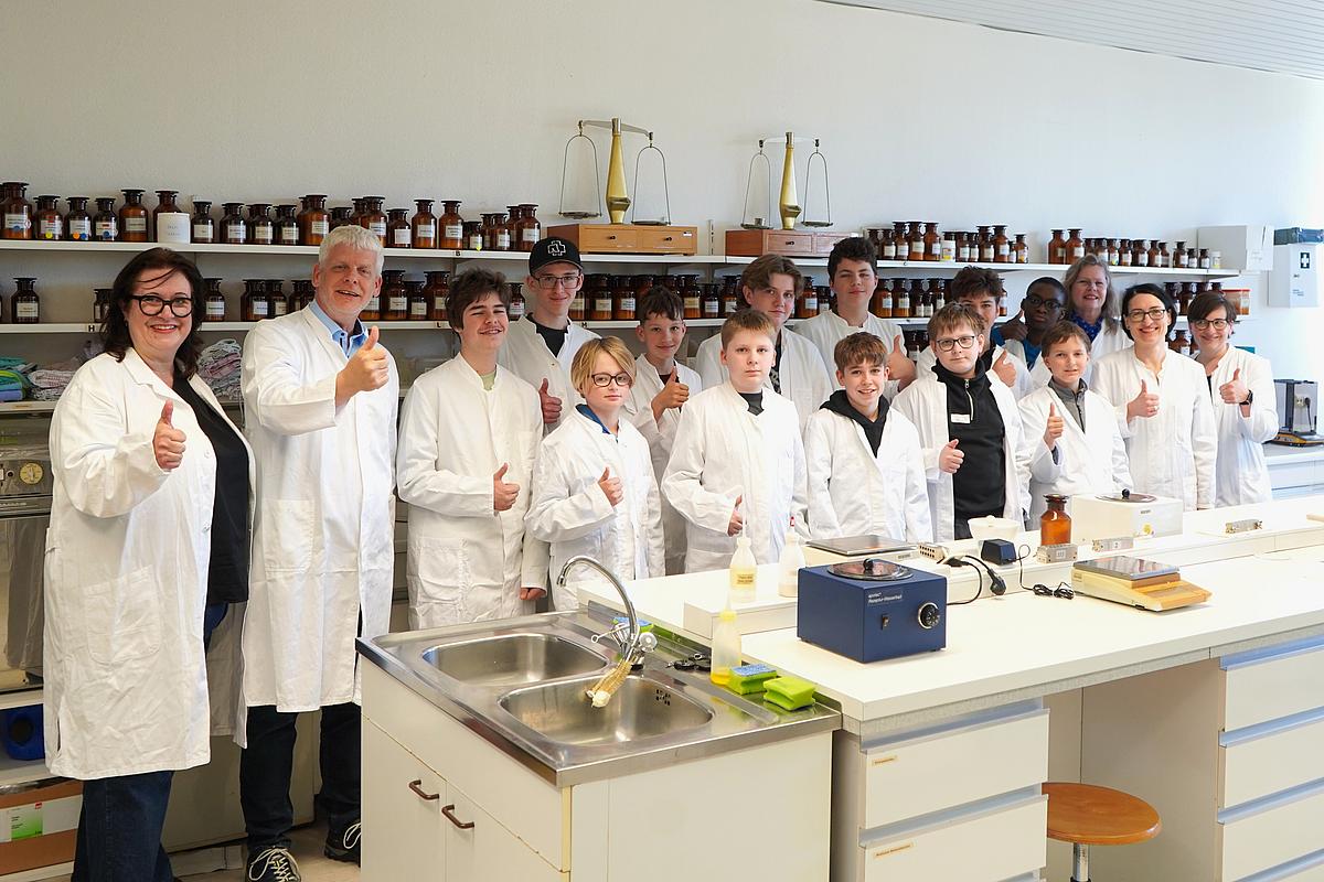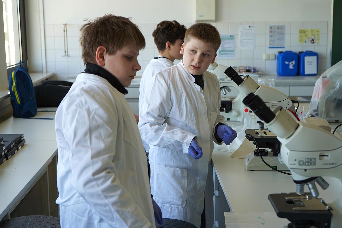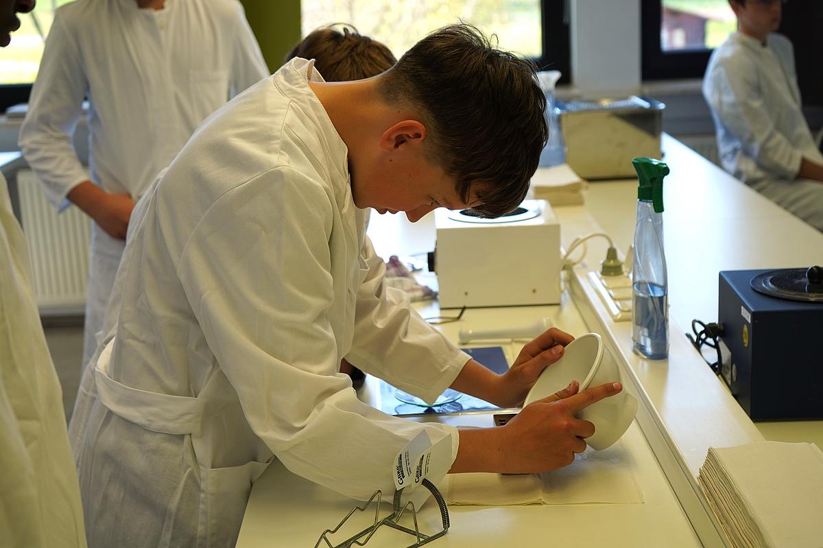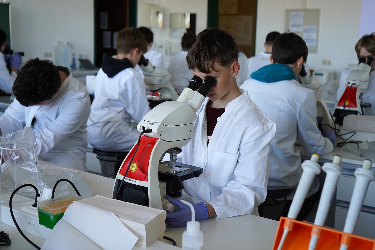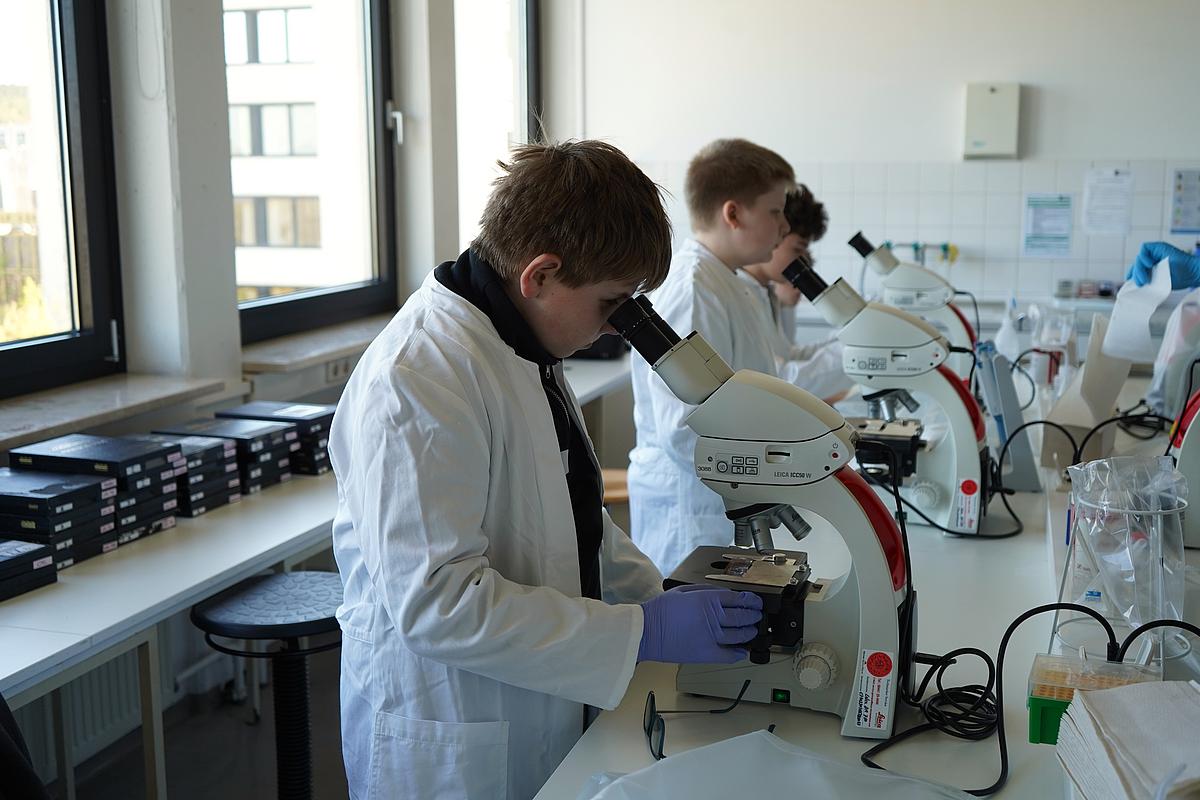Im Labor wurde es konkret: In den üblichen weißen Kitteln stellten die Schüler unter Anleitung medizinische Zäpfchen her und lernten mehr über hygienisches Arbeiten und pharmazeutische Herstellungsprozesse. Abgerundet wurde der praktische Teil durch Mikroskopie: Eigene Präparate von Mundschleimhautzellen konnten angefertigt, eingefärbt und anschließend unter dem Mikroskop analysiert werden. Besonders die beeindruckende Technik der medizinischen Maschinen und dem hochwertigen Equipment in den Laboren stieß auf großes Interesse.