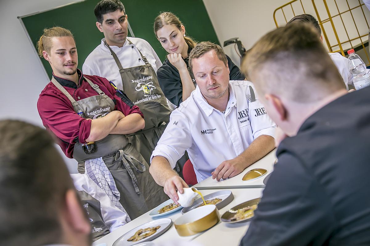 Der Startschuss fällt auch heuer mit Fabian Beck – er führt die Nachwuchsköche traditionell Beck to grill. Und schon nach kurzer Zeit wird klar, was das Jugendcamp auszeichnet: Neben verschiedenen Trends, Techniken und Warenkunde nehmen sich Beck und seine Referenten-Kollegen Zeit, um aus dem Nähkästchen zu plaudern. „Legt euch ein eigenes Rezeptbuch an und füttert es nur mit bewährten Rezepten, die ihr schon ein paarmal ausprobiert habt.“ Und die dürfen laut Beck auch von anderen stammen. Mit offenen Augen durch das Berufsleben gehen ist seine Devise. „Ich habe mein Buch seit der Lehrzeit und immer dabei.“ Natürlich dürfen die Teilnehmer auch in seinem Werk spicken.