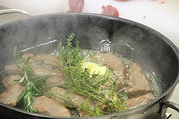 Ob Braten, Kochen oder Sous-Vide-Garen: Bei der Zubereitung gibt es einiges zu beachten. Nieren etwa müssen erst von dem strengen Uringeruch befreit werden. Traditionell werden sie mit reichlich Essig gekocht und als Saure Nieren serviert. Das geht "raffinierter und zeitgemäßer", weiß Maurer. Zuerst gilt es das Fett zu entfernen, die Nieren kleinzuschneiden und reichlich Salz einzumassieren: "Das Salz zieht die Flüssigkeit aus dem Gewebe und neutralisiert somit den Geruch", sagt er. Kurz abgewaschen sind die Innereien bereit mit Gemüse, Kräutern und Knoblauch angebraten zu werden.