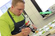Der nächste Morgen. Ausgeruht und in voller Kochmontur sind die Nachwuchsprofis bereits voll in Action. Gemeinsam mit dem renommierten Kochprofi und Unternehmer Markus Haxter veranstalteten sie „kleine Schweinerein“ in der Lehrküche. Der gelernte Küchenmeister überzeugte mit Fingerfood vom Feinsten. Der Nürnberger Gourmet-Patissier Jens Brockerhof lockte wiederum mit süßen Verführungen: Französische Desserts, Pralinen und Garnituren war das Leitthema seines Workshops. Bei Heiko Antoniewicz wurde es deftig: Der preisgekrönte Kochbuchautor kombiniert Sous-vide – auch Vakuumgaren genannt – mit außergewöhnlichen Aromen. Ein besonderer Augenschmaus kam bei Christian Giesches auf die Teller, im Workshop Fooddesign & Foodfotografie.