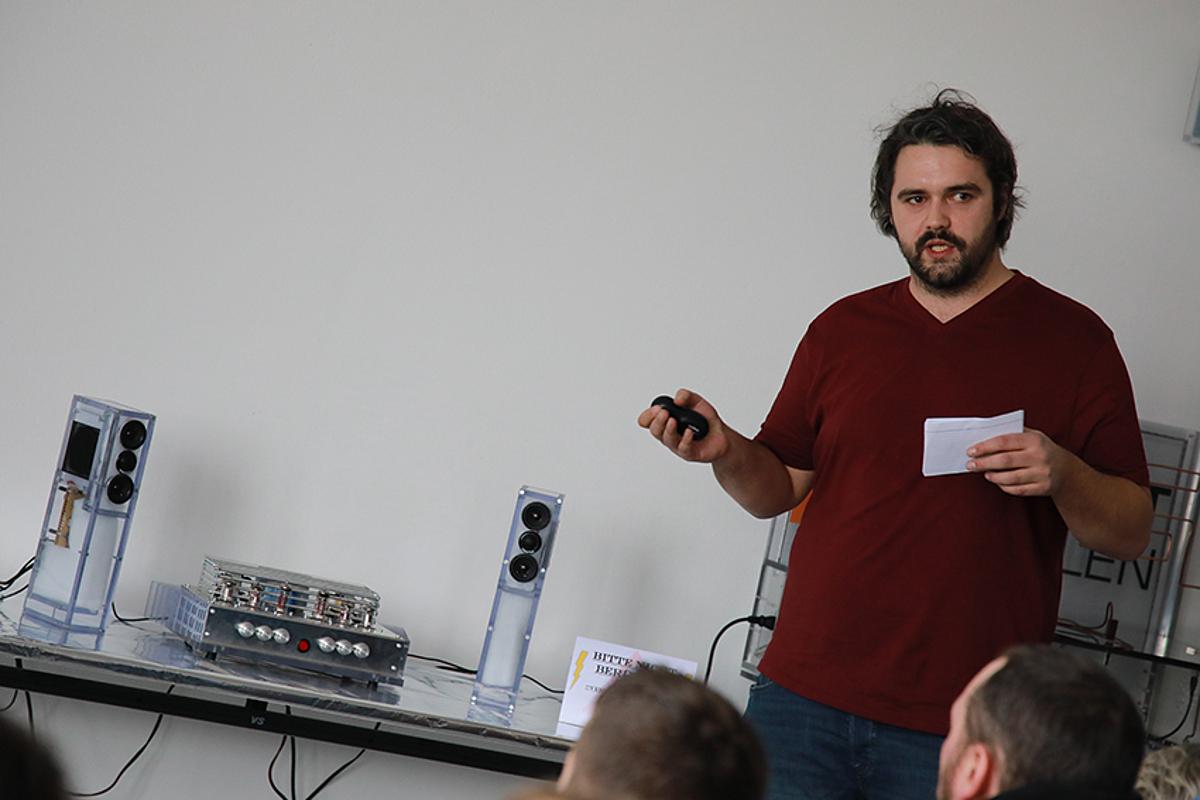 Das Projektteam aus Erstsemestern nahm sich einer besonderen Herausforderung an: Nach nur 6 Monaten Unterricht planten und konstruierten sie einen Röhrenverstärker mit optischer Anzeige und dazugehörigen Dreiwegeboxen für die akustische Wiedergabe.