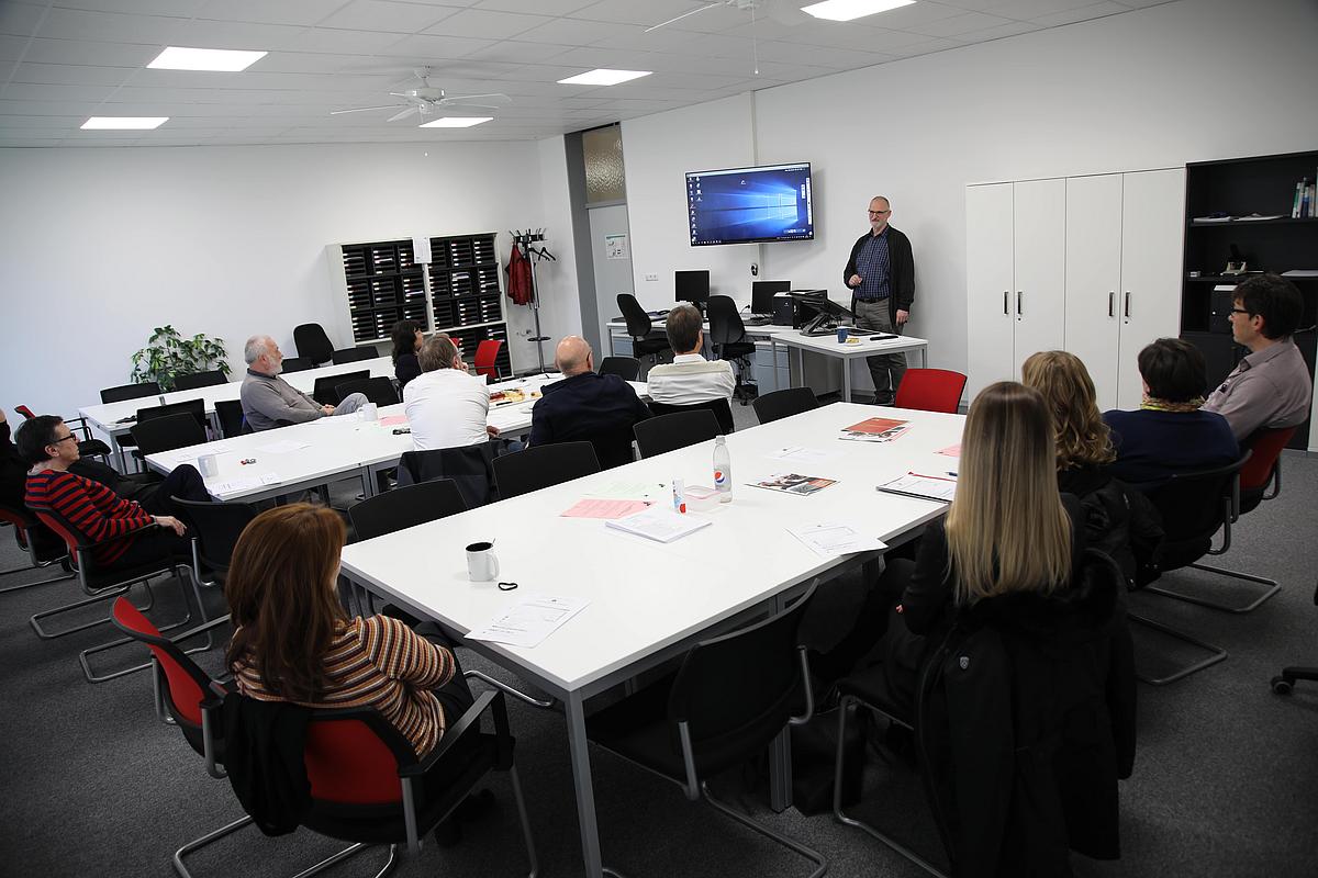 Während Manfred Haller, Dozent im kaufmännischen Bereich, und Reinhold Rieger, Fachbereichsleiter Maschinenbau, die Kollegen der Sozial- und Integrationsberatung in zwei Niveaustufen in Excel einführten, erhielt der Medizinische Dienst eine Schulung in Notfallmedizin. Der Fachdienst der Psychologie widmete sich Verbesserungsmöglichkeiten bei der Erstellung der psychologischen Gutachten unserer Assessmentmaßnahmen. Parallel dazu erläuterte Dr. Dietmar Bräuer im Lehrerzimmer der Schule I den interessierten Workshopteilnehmern die Anwendungsgebiete und Möglichkeiten eines Touchscreen-Monitors. Im Fachbereich Augenoptik hielt Abteilungsleiterin Andrea Lang eine Einführung zum Umgang mit dem Schleifautomat Essilor Kappa, mit dessen Hilfe Brillengläser präzise hergestellt werden können. Bei den Qualitätsfachleuten gab es von Herrn Dirscherl, Herrn Fries, Herrn Zimmerer und Herrn Hackl Einblicke in die „Handhabung des Digitalmikroskops Keyence und der Formprüfmaschine der Firma Mahr". Bei den Bauzeichnern stand Nemetschek Allplan 2019 mit Frau Wenzel auf dem Plan, während Herr Zollner in der Lehrwerkstatt die Grundzüge des Werkzeugkatalogs CTXalpha vermittelte.